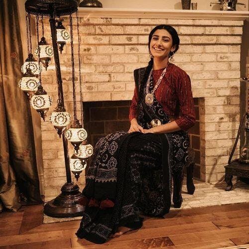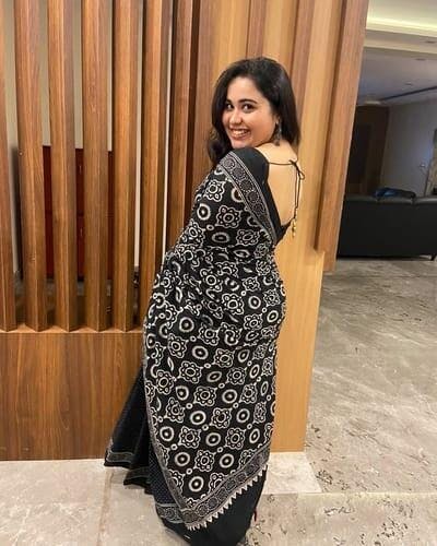 Featuring a black cotton mul saree, crafted with hand block imprints and finished by dainty tassel highlighting. A perfect piece of clothing to guide your ethnic style for musical soirées.
