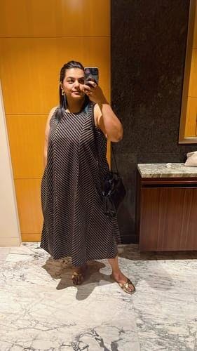 The dress features a boat neckline, which adds a touch of grace and femininity to your look. With its sleeveless design, it allows for freedom of movement and keeps you cool during warmer days. The mesmerizing handblock-printed stripe patterns in black create a striking contrast, adding a touch of uniqueness and charm to the dress.