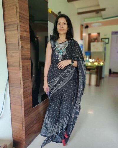 "Delight your style in the refreshing weaves of this black beauty on the base of cotton mul fabric. Assorted with the dainty charms of handblock imprints. This piece of surreal drape is all crafted to enhance your cultural vogue.