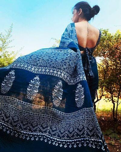 Indigo Bouquet Hand Blockprinted Cotton Saree