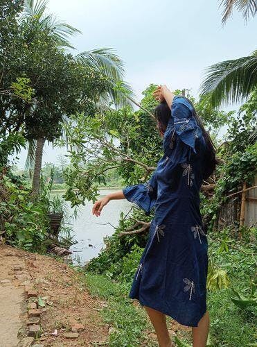 Listen to stories, dreams and aspirations shared by the clouds while donning this pure cotton, blue blockprinted dress with pocket detailing.