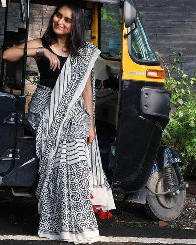 Rewamp your style with the subtle charm of this pure cotton handprinted lavender blouse with the classic butterfly and crescent motifs. Finished by round neckline, front buttons, and half sleeves. Adorn it with the elegant matching saree to bring out more charm