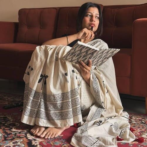 A ivory cotton mul saree adorned with charming dragonfly block imprints. Followed by the dainty details of tassel highlighting on the end of the pallu to complete the whole beauty.