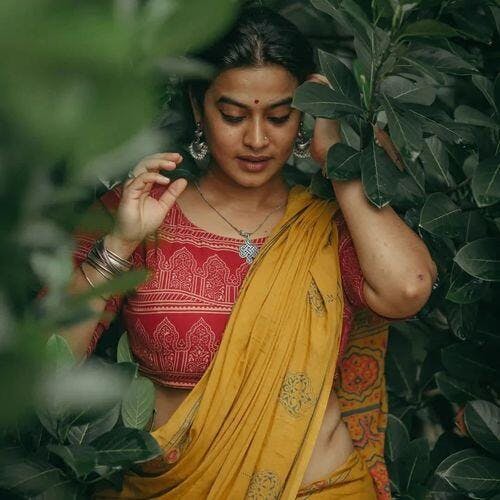 Swirl, twirl, and sway freely and confidently in this handmade, handprinted cotton saree. The experience of being with oneself is liberating.