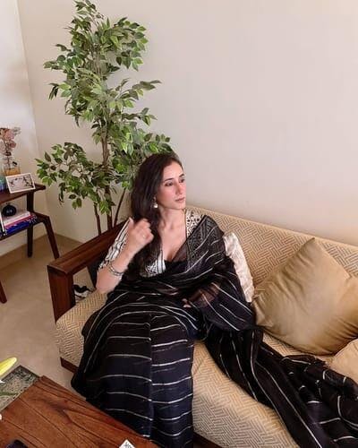 Meet the Charm & Charisma of yesteryears in Nutan Silver Striped Black Handwoven Linen Saree from our collection 'Yesterday', our love story with natural handwoven linen.